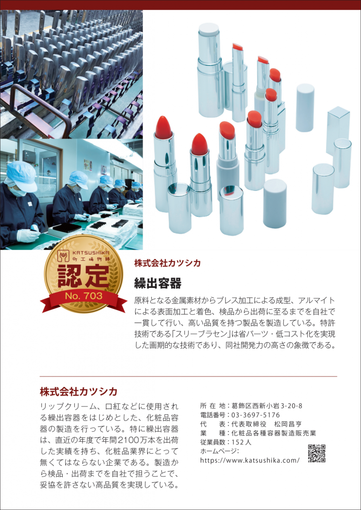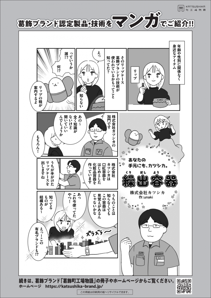 弊社の製造する繰り出し容器について、漫画にて紹介している葛飾ブランド「葛飾町工場物語」第19回(令和7年度)が、Amazon Kindleで無料公開されました。自社一貫製造を行っている化粧品容器メーカーとしての弊社の記事をぜひご覧ください。Amazon公式サイトはこちら